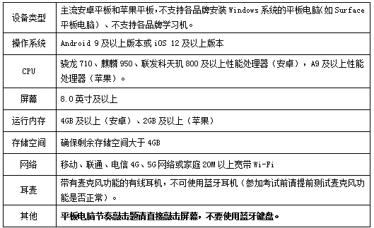 1.设备要求:考试支持计算机、Pad和手机3种设备类型,考生根据自身情况自备考试设备(至少1种),设备具体要求如下